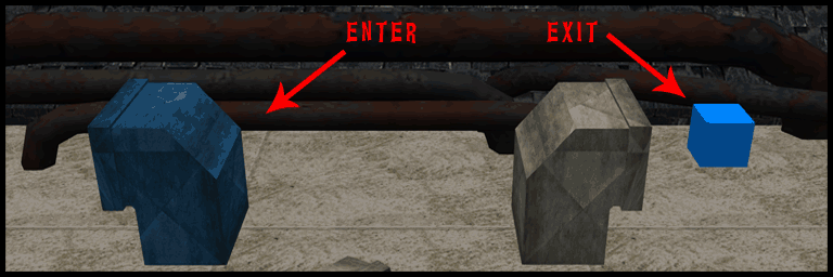 The image below shows the ENTER point, and where the EXIT would be. Note that the EXIT location is represented as a blue cube, and not the second duct as that will cause the player to be moved inside the second vent.